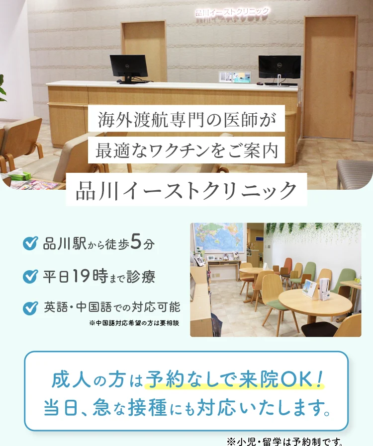 (海外向け)都内でも最大級のトラベルクリニックを有し、22以上の実績と経験、独自のネットワークを構築。最新情報をもとに適切な感染症予防対策をご案内します。輸入ワクチンは常時豊富な在庫を取り揃え、当日予約・接種が可能です。